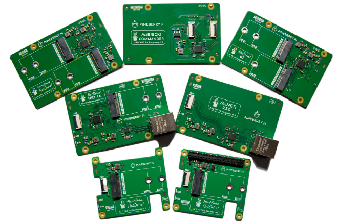 - HatDrive! NET 1G: Combines Gigabit Ethernet (Realtek RTL8111H) with an M.2 M-Key socket for NVMe 2230 or 2242 SSDs, through an ASMedia PCIe switch. Booting from SSD is currently unsupported.