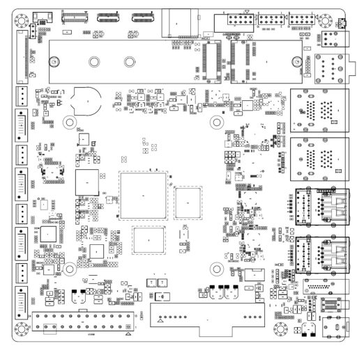 The board has plenty of I/O, featuring a 24-pin ATX connector for power supply, DC power input, PoE interface, LCD and camera connectors, an M.2 E-Key connector for wireless cards, and an assortment of ports including HDMI, eDP, USB-C, SPDIF, 3.5mm audio, USB 3.0 Type-A, and Ethernet.